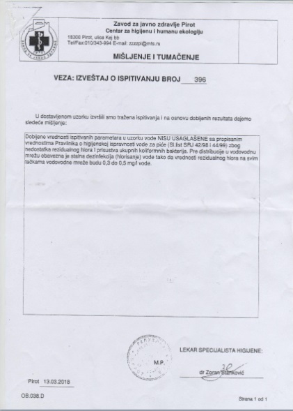 Posle objavljenog teksta, na naš poziv javila se Leposava Veljković, šef sanitarne inspekcije. Rekla nam je da o seoskim vodovodima koji nisu u sistemu JP Vodovod i kanalizacija, brinu gradske službe. Da nije postupila po nalazu Zavoda za javno zdravlje jer je saznala da je uzorke odnelo privatno lice. Veljkovićeva je dala nalog predsedniku Mesne zajednice da službeno zatraži novu analizu Zavoda za javno zdravlje, koji jedini može da uzorkuje vodu iz vodovoda. Od Leposave Veljković smo saznali da u selu postoji obučeno lice za hlorisanje vode!