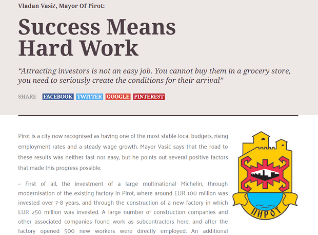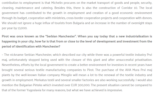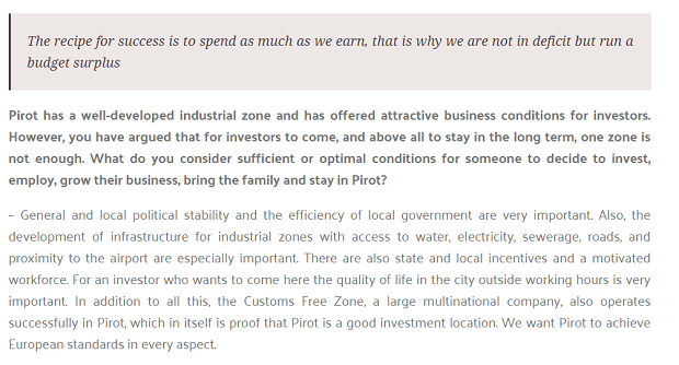 - U postojeće pogone francuski i svetski gigant investirao je poslednjih sedam – osam godina preko 100 miliona evra, a u izgradnju nove fabrike “Big Tigar” dodatnih 250 miliona. Ta investicija omogućila je upošljavanje dodatnih 500 radnika. Takođe, tu je i izgradnja Koridora 10 gde je takođe upošljen veliki broj manjih firmi iz ovog dela Srbije, otvorena nova radna mesta. Sa druge strane, Gradska uprava u Pirotu nastoji da što je moguće više poboljša ambijent za investicije ali i uslove za život u samom gradu pa je tako Pirot jedan od lidera u Srbiji kada je reč o realizaciji projekata Prekogranične saradnje između Bugarske i Srbije, finansiranog od strane EU-kazao je gradonačelnik Vasić za manazin CORD.