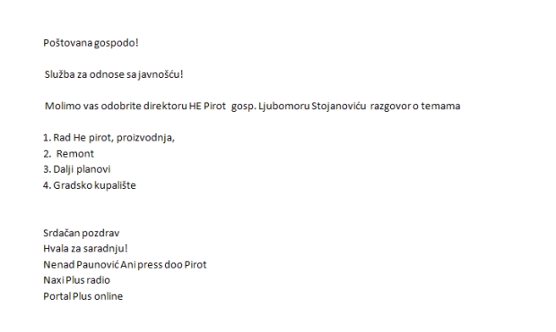 U sve to mi smo pisali i još jedno pismo, tako su nam tražili u kojem smo se obratili Informativnoj službi HE Djerdap da, kakav je valjda postupak, odobri direktoru HE Pirot, Ljubomiru Stojanoviću, da prihvati razgovor. Evo mejla: