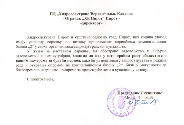 U medjuvremenu, kako je i najavio gradonačelnik Vladan Vasić, Grad Pirot je , zarad Piroćanaca, prvi povukao potez, pružio ruku i juče poslao pismo sledeće sadržine. Pismo je potpisao Milan Popović, predsednik SO Pirot. Postavljamo u originalu!