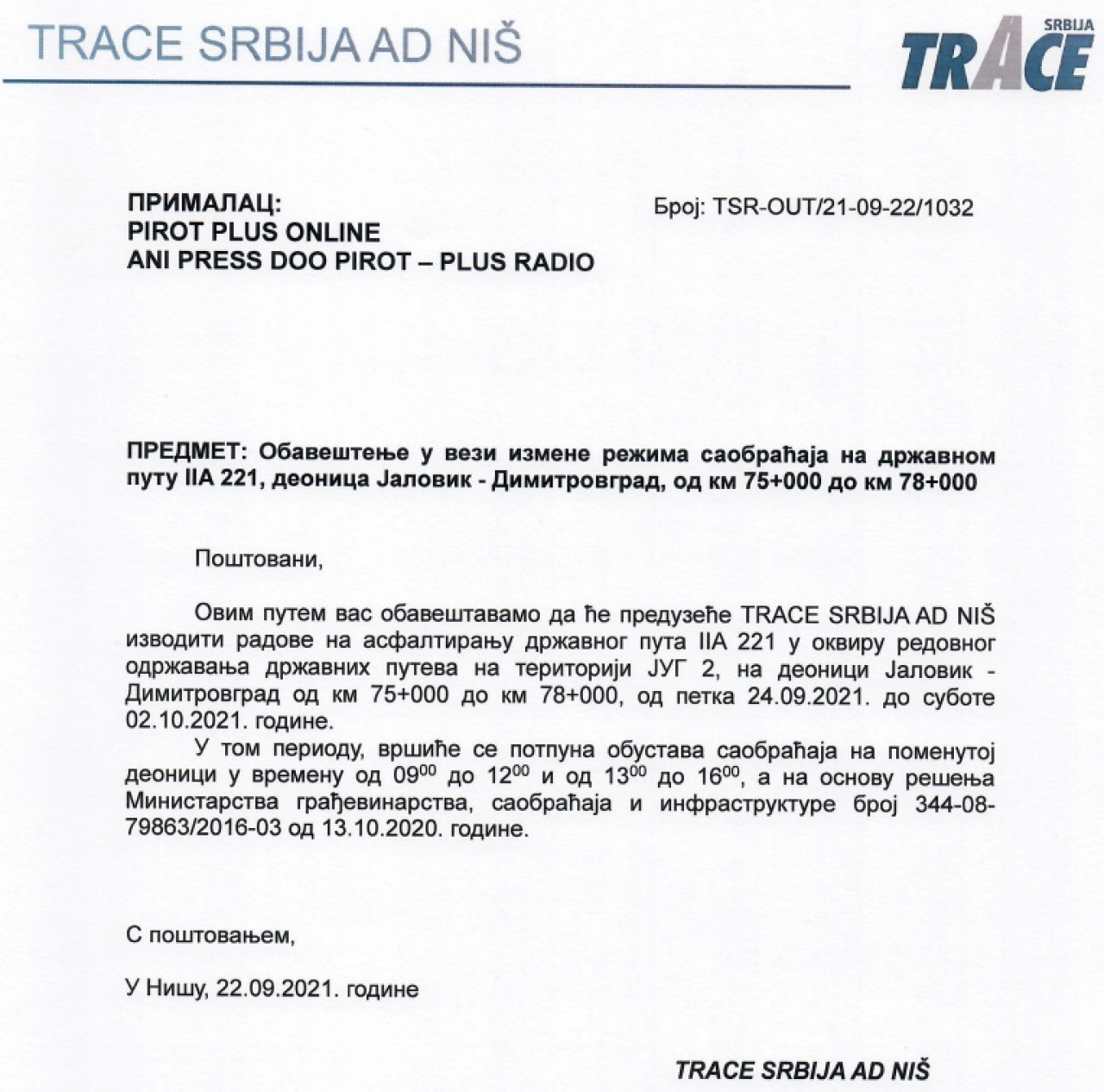 Iz preduzeća Trace Srija AD Niš javljaju da će zbog asfaltiranja dela puta IIA reda Jalovik-Dimitrovgrad u periodu od petka 24. septembra do subote, 2. oktobra doći do potpune obustave sobraćaja na deonici Planinarski dom - Rsovci u periodu od 9 do 12h i od 13do 16h.
