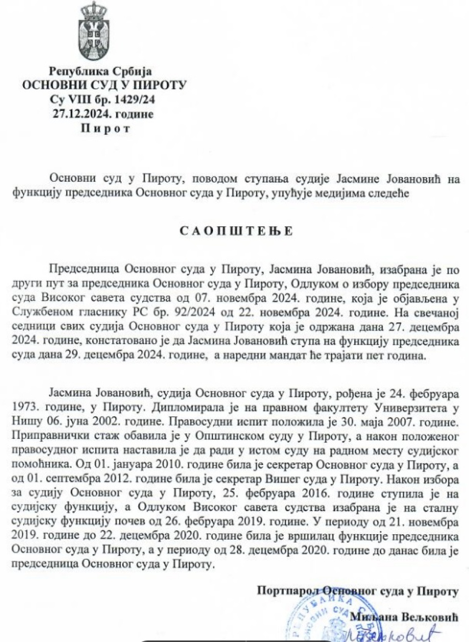Jasmina Jovanović izabrana, po drugi put, za predsednika Osnovnog suda u Pirotu