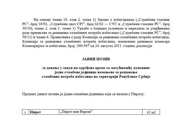 Komisija za rešavanje stambenih potreba izbeglica, imenovana rešenjem komesara Komesarijata za izbeglice, objavila je Javni poziv za davanje u zakup na određeno vreme sa mogućnošću kupovine jedne stambene jedinice namenjene za rešavanje stambenih potreba izbeglica na teritoriji Republike Srbije.