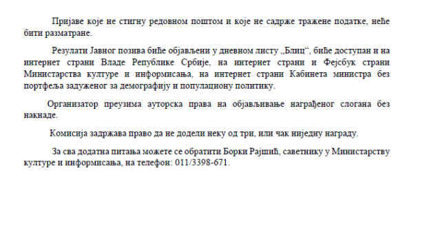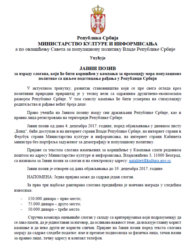 Ministarstvom kulture i informisanja objavilo je Javni poziv za izradu slogana koji ce biti koriscen u kampanji za promociju mera populacione politike sa ciljem podsticanja radjanja u Republici Srbiji.