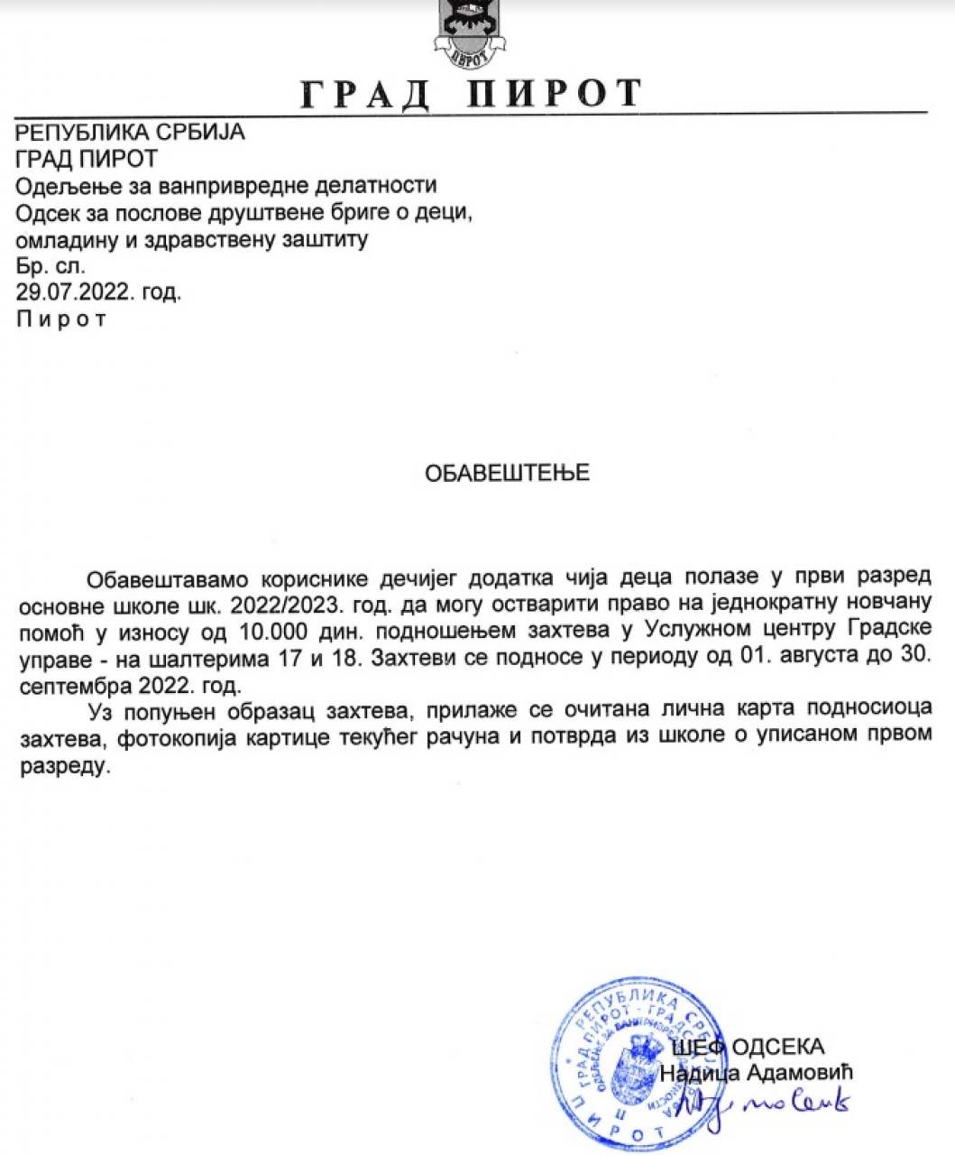 Odeljenje za vanprivredne delatnosti, Odsek za poslove društvene brige o deci, omladinu i zdravstvenu zaštitu, obaveštavaju korisnike prava na dečiji dodatak čija deca polaze u prvi razred osnovne škole šk. 2022/2023. god. da se jave u Uslužni centar Gradske uprave – Jedinstveno upravno mesto na šaltere 17 i 18, radi ostvarivanja prava na jednokratnu novčanu pomoć.