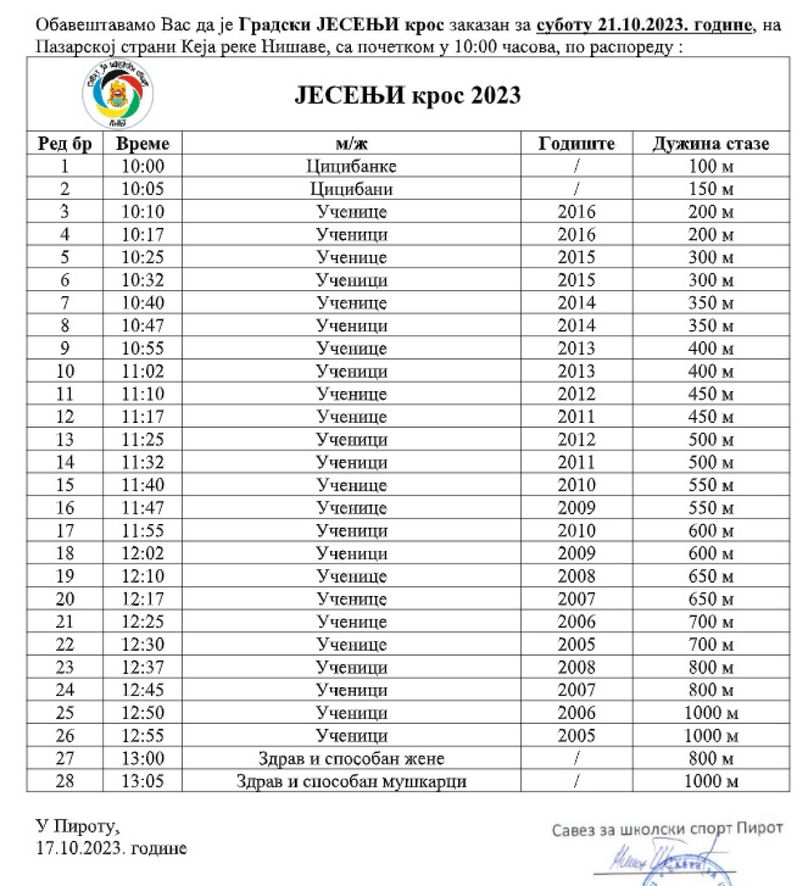 Tradicionalni Jesenji kros, u organizaciji Saveza za školski sport, održaće se u subotu, 21. oktobra na pazarskoj strani keja reke Nišave.