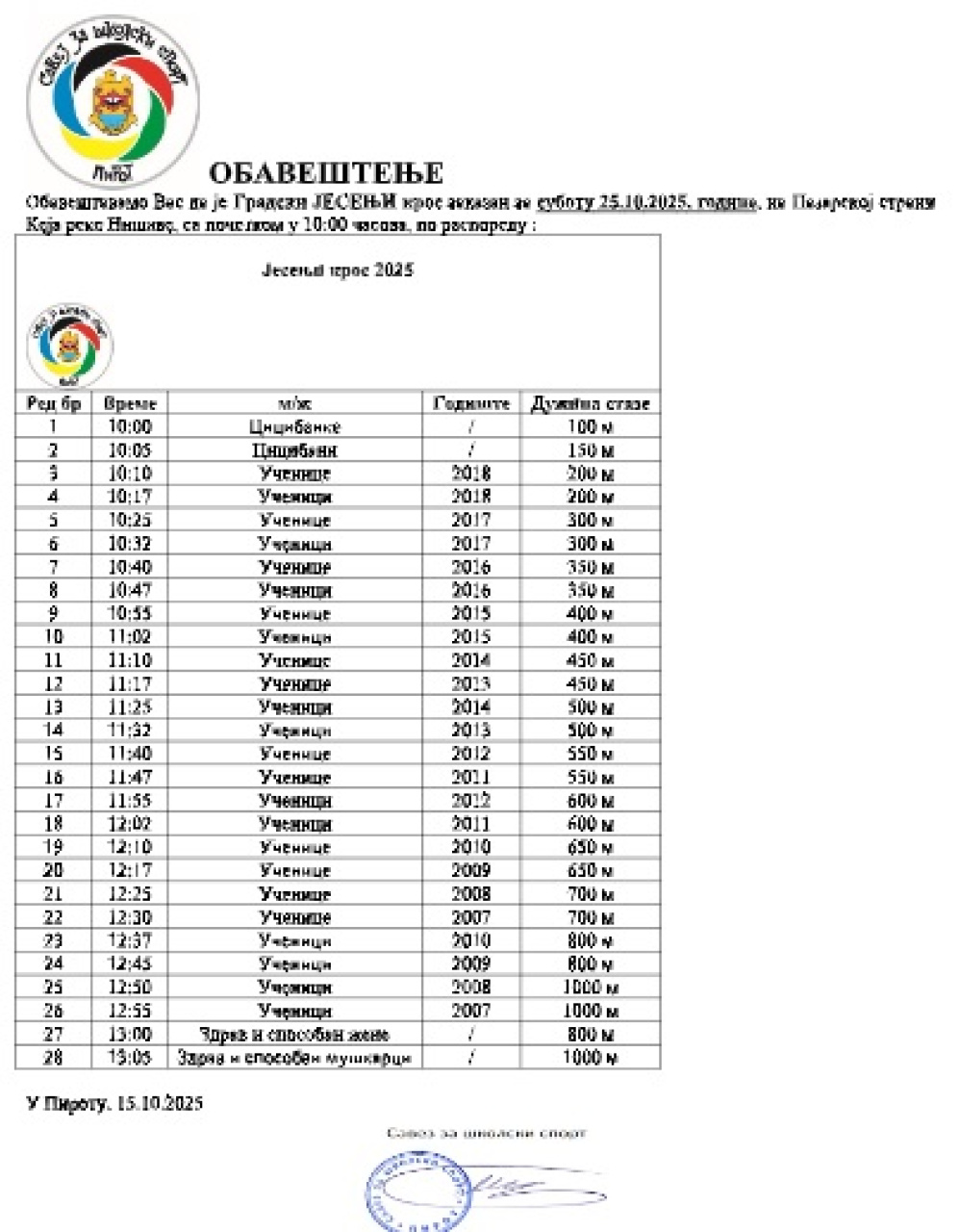22. okt 2025. 10:00 Savez za školski sport grada Pirota organizuje Jesenji kros na pazarskoj strani Keja, pored Nišave. Kros će biti održan sledeće subote, 25. oktobra sa početkom u 10 časova.Raspored trka: -