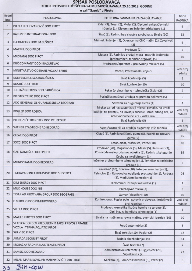 Nacionalna služba za zapošljavanje – filijala Pirot u četvrtak, 25. oktobra u Restoranu "Gazela" organizuje jesenji Sajam zapošljavanja. Na sajmu će se predstaviti 33 poslodavca koji su iskazali potrebu za preko 260 radnika različitih zanimanja