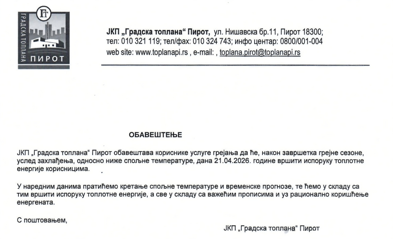 21. apr 2026. 11:33 Saopštenje JP "Gradska toplana" Pirot -