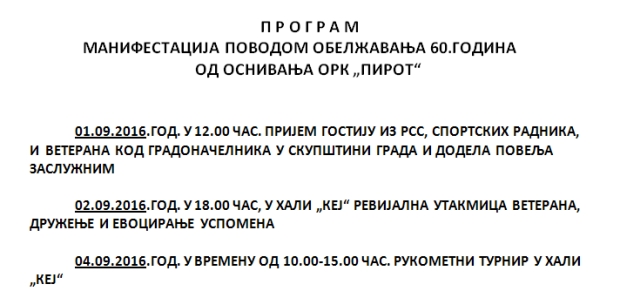 Ovih dana, kada će sve još mirisati na slavljeničku atmosferu povodom slave Grada “Velike Gospojine” i čuvenog Pirotskog vašara, Omladinski rukometni klub “Pirot” prigodnim programom obeležiće 60. jubilarni rodjendan. U četvrtak, 1.septembra gradonačelnik,Vladan Vasić, će prirediti prijem za goste, veterane i sportske radnike. Sutradan je revijalna utakmica veterana u Hali Kej a u nedelju rukometni turnir, kaže pored ostalog, u intervjuu za Portal Plus online predsednik Kluba, Ninoslav Ćirić.