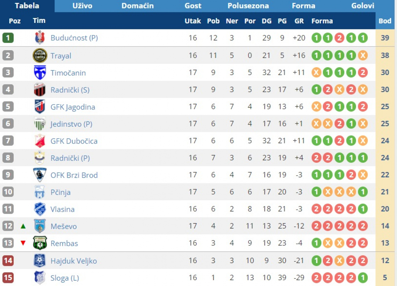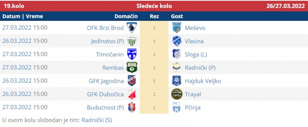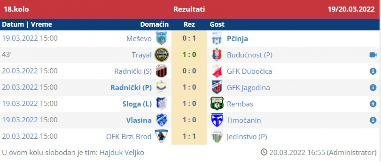14. apr 2026. 17:45 Omladinska liga FS RIS, 22. koloPomoćni teren Stadiona "Dragan Nikolić"Pirot: Radnički - Radnički (Niš) 1:2 (0:0)Radnički Pirot: Jovanović, D. Rančić, Mančić, Denčić, Aleksić, Nakov, Ćirić, Lu.... -
