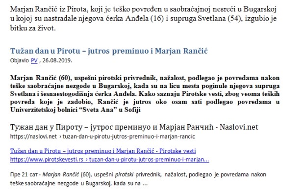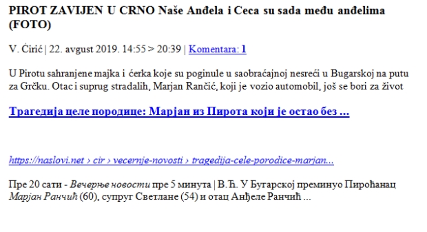 ... Proteklih dana Pirot je jecao! Tugovala je rodbina, plakali su svi koji su Cecu znali ili svakodnevno dolazili, radili u Pi kanalu. Devojčice i dečaci nisu verovali da mala Andjela neće doći na prve školske časove. Strepnja da Marjan neće izrdžati poslednju životnu borbu, nažalost, juče je postala bolna istina...