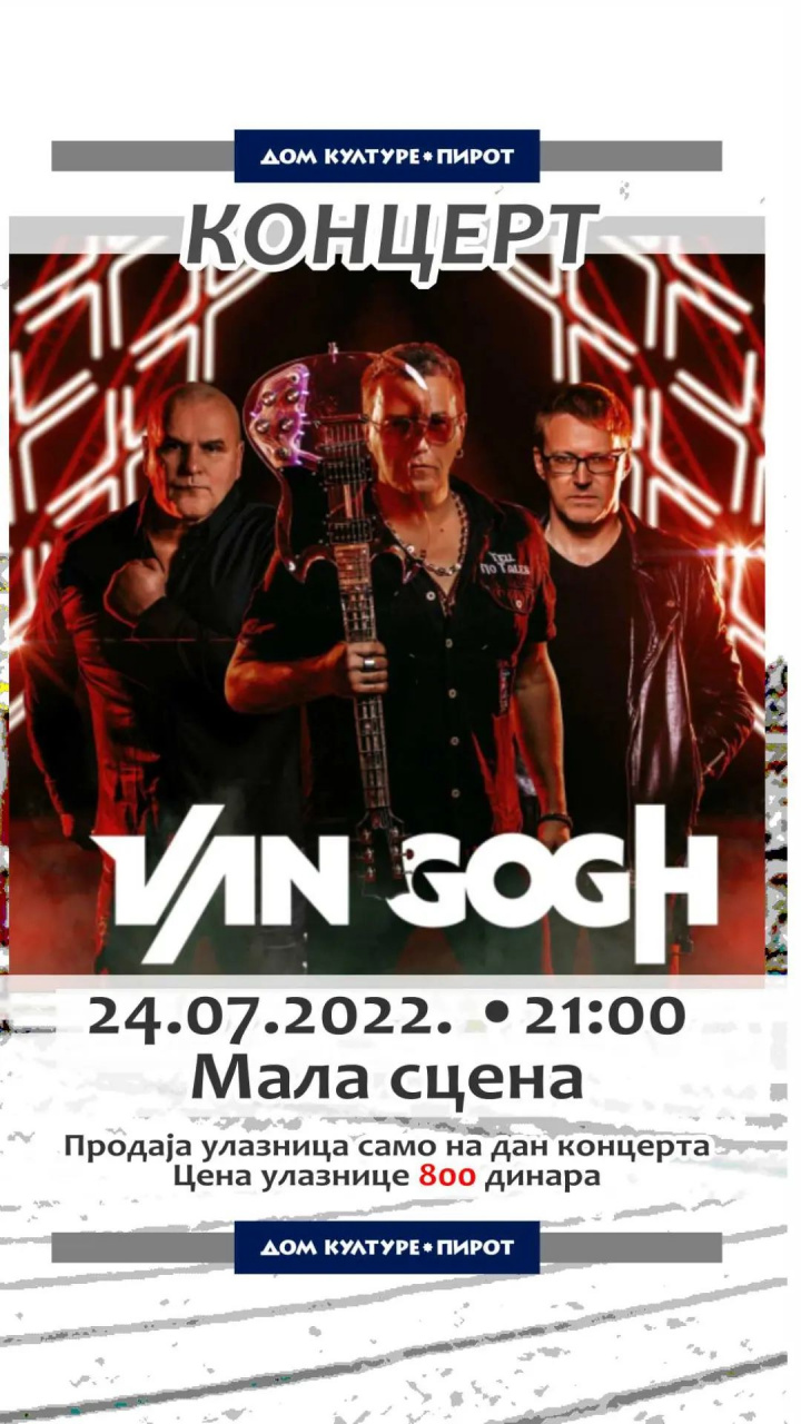 •Кoncert grupe „VAN GOG“ koji je otkazan 09. jula 2022. godine u organizaciji Doma kulture Pirot održaće se u nedelju, 24. jula 2022. godine.
