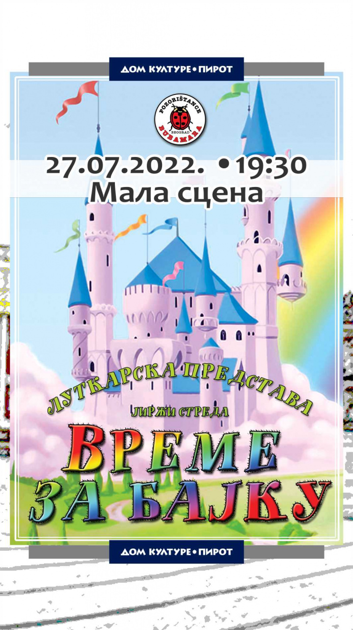 • Sreda, 27. jul. 2022. godine od 19:30 sati u prostoru Male scene u dvorištu Istorijskog arhiva dečija lutkarska predstava „VREME ZA BAJКU“.