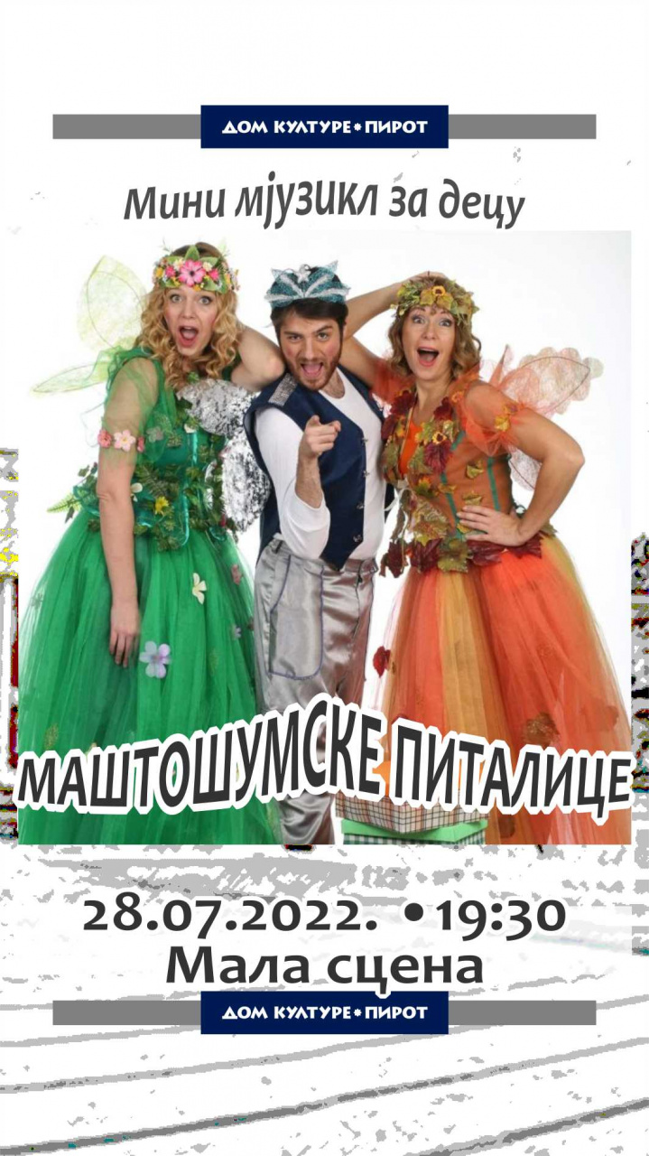 • Četvrtak, 28. jul 2022. godine od 19:30 sati u prostoru Male scene u dvorištu Istorijskog arhiva mjuzikl za decu „MAŠTOŠUMSКE PITALICE“.