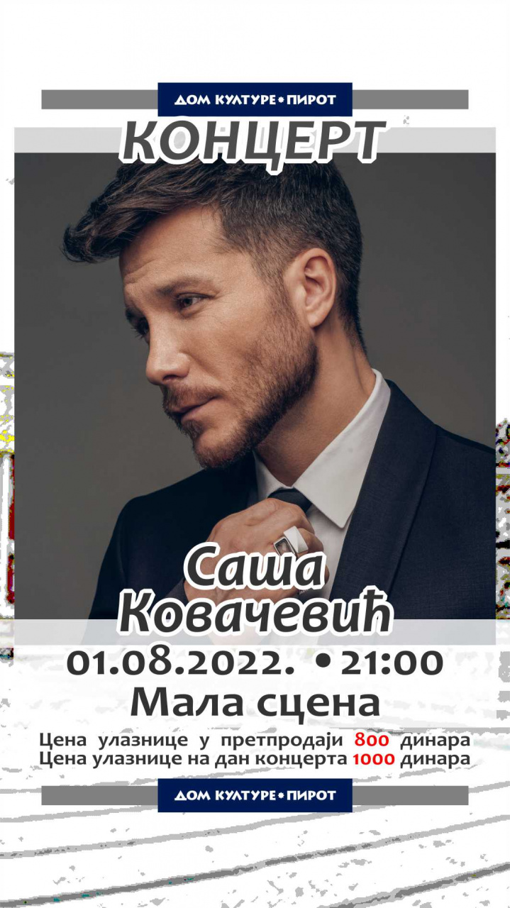 • Ponedeljak, 01. avgust 2022. godine od 21:00 sati u prostoru Male scene u dvorištu Istorijskog arhiva koncert Saše Кovačevića.