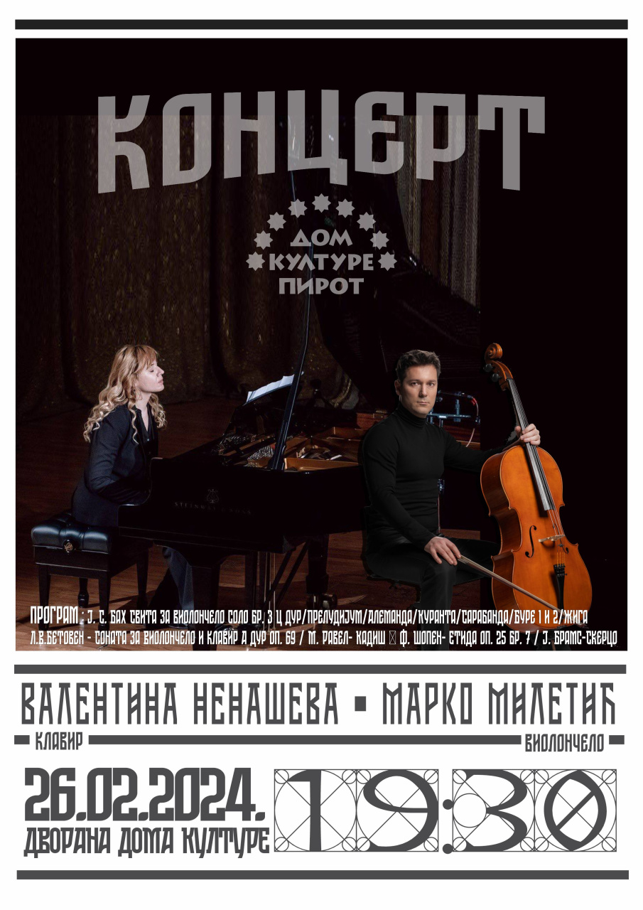 Pirotskoj publici će se predstaviti Marko Miletić na violončelu i pijanistkinja Valentina Nenaševa.