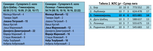 Seniorke Gimnazijalca su ovog vikenda odigrale poslednje dve utakmice u ovoj takmičarskoj sezoni. Na gostovanju u Loznici ostvarena je i treća pobeda u Super ligi druge lige jug nad ekipom Loznice rezultatom 74:54, dok je u Šapcu domaća Duga bila bolja i slavila rezultatom 60:58.