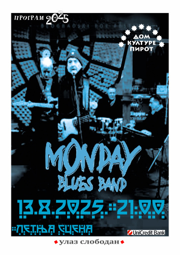 12. avg 2025. 09:55 Dom kulture Pirot u okviru manifestacije Pirotsko leto 2025. U narednom periodu organizuje sledeće programe:Sreda, 13.08. 2025. od 21:00 sati na letnjoj sceni – koncert grupe „Monday ...