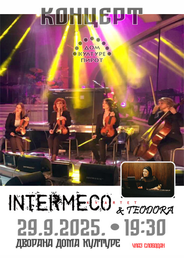 26. sep 2025. 08:39 U ponedeljak, 29. septembra 2025. godine Dom kulture Pirot organizuje koncert kvarteta INTTERMECO & TEODORA.Koncert će se održati u dvorani Doma kulture Pirot sa početkom od 19:30 sati.Ulaz je ... -