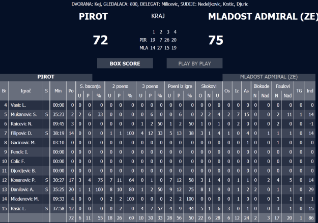 Pirot – Mladost Admiral Zemun 72:75 ( 19:14, 7:27, 26:15, 20:19)