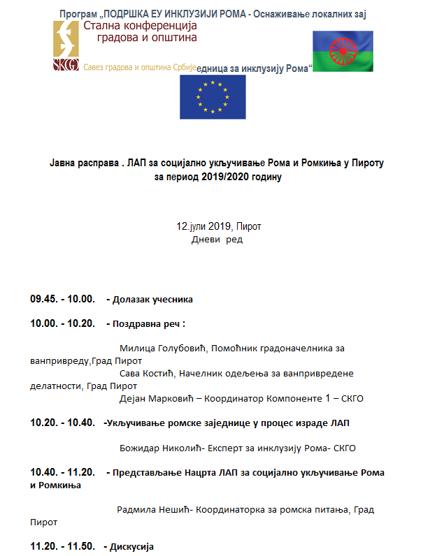Na osnovu Sporazuma o saradnji u okviru programa “Podrška EU inkluziji Roma – Osnaživanje lokalnih zajednica za inkluziju Roma” Stalna konferencija gradova i opština potpisala je, sredinom prošle godine, sporazume o saradnji sa 10 izabranih gradova i opština koji su dobiti sveobuhvatan paket podrške za izradu i unapređenje strateških, finansijskih i institucionalnih mehanizama u sprovođenju mera socijalnog uključivanja Roma i Romkinja, medju kojima je i grad Pirot. Cilj je poboljšanje socio-ekonomskog položaja romske populacije i sprovođenja prioritetnih strateških mera iz Strategije za socijalno uključivanje Roma i Romkinja u Republici Srbiji za period od 2016. do 2025. godine.
