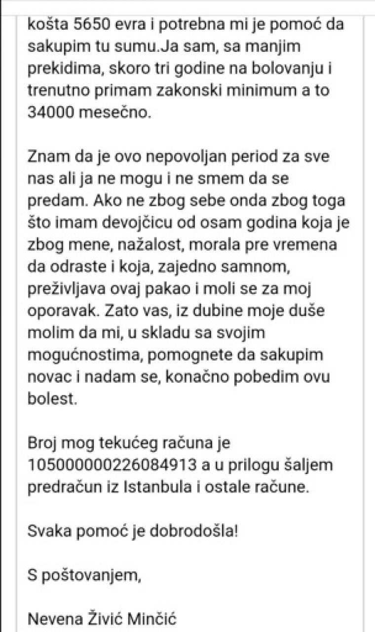 Neveni Živić Minčić, majci jedne male devojčice , s obzirom na iznos, mogu da pomognu mnogi i da ne primete da su sa svojih računa skinuli makar trećinu, četvrtinu tog iznosa.