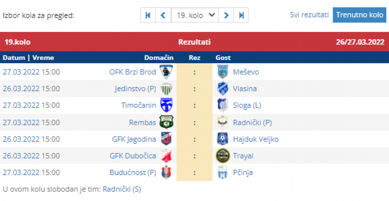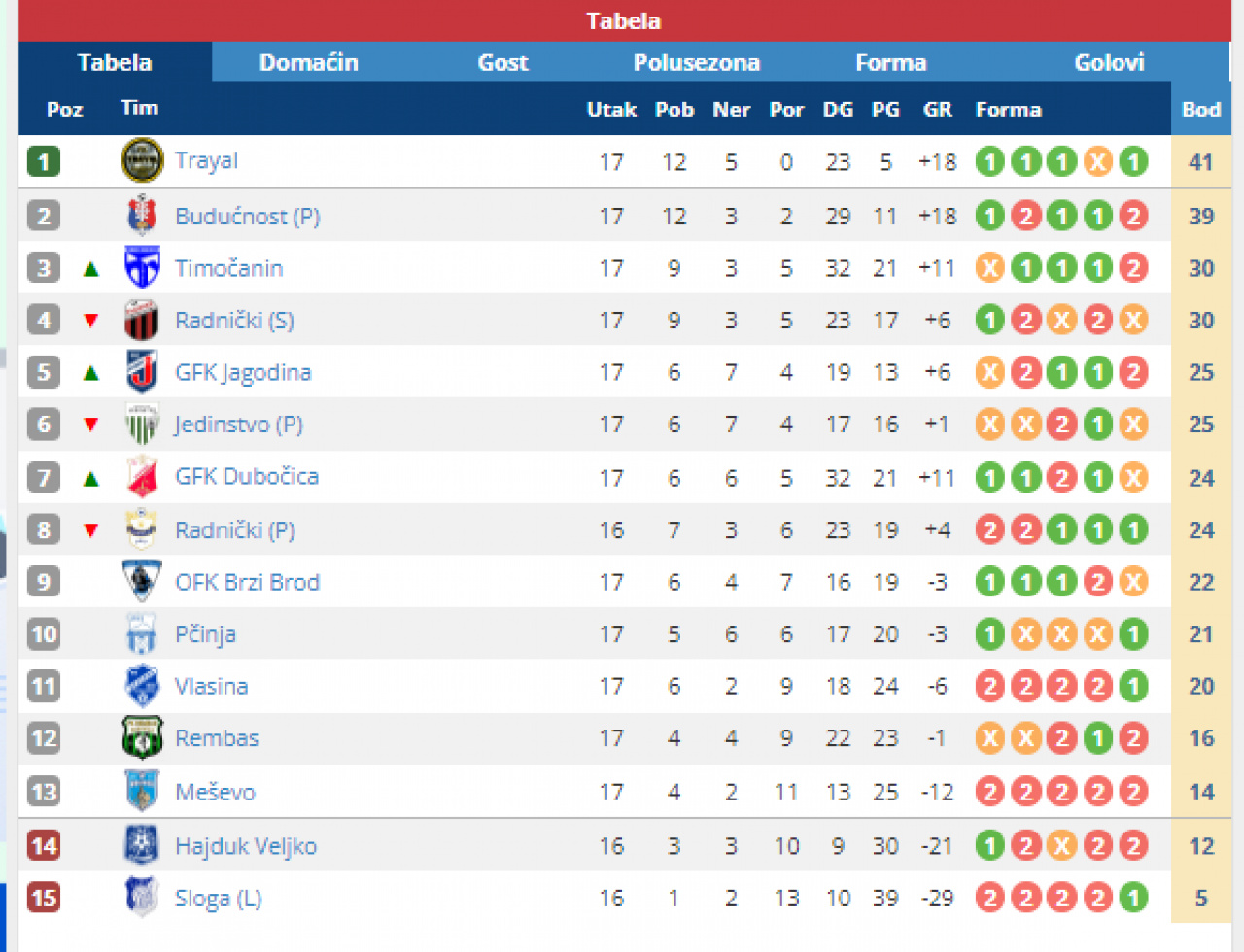 23. nov 2025. 18:32 Srpska liga Istok, 15. koloStadion "Dragan Nikolić"Pirot: Radnički - Timok (Zaječar) 1:2 (1:2)Radnički: Ristić, Antić, Tanasijević, Petrov, Mladenović, Ristov, S. Stanković, Dušanić (...