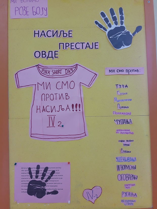 Svesni činjenice da je nasilje, bilo kojeg oblika, prisutno svakodnevno u svim okruženjima, učenici četvrtog razreda OŠ,,Sveti Sava”, sa učiteljicom Marijom Nikolić, obeležili su Međunarodni dan prevencije vršnjačkog nasilja „Dan roze majica“ („Pink Shirt Day“).