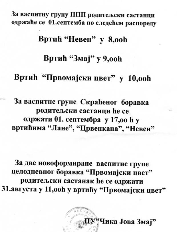 Školska godina u Predškolskoj ustanovi ,,Čika Jova Zmaj,, počinje 1. septembra. Sve potrebne informacije nalaze se na oglasnim tablama vrtića.