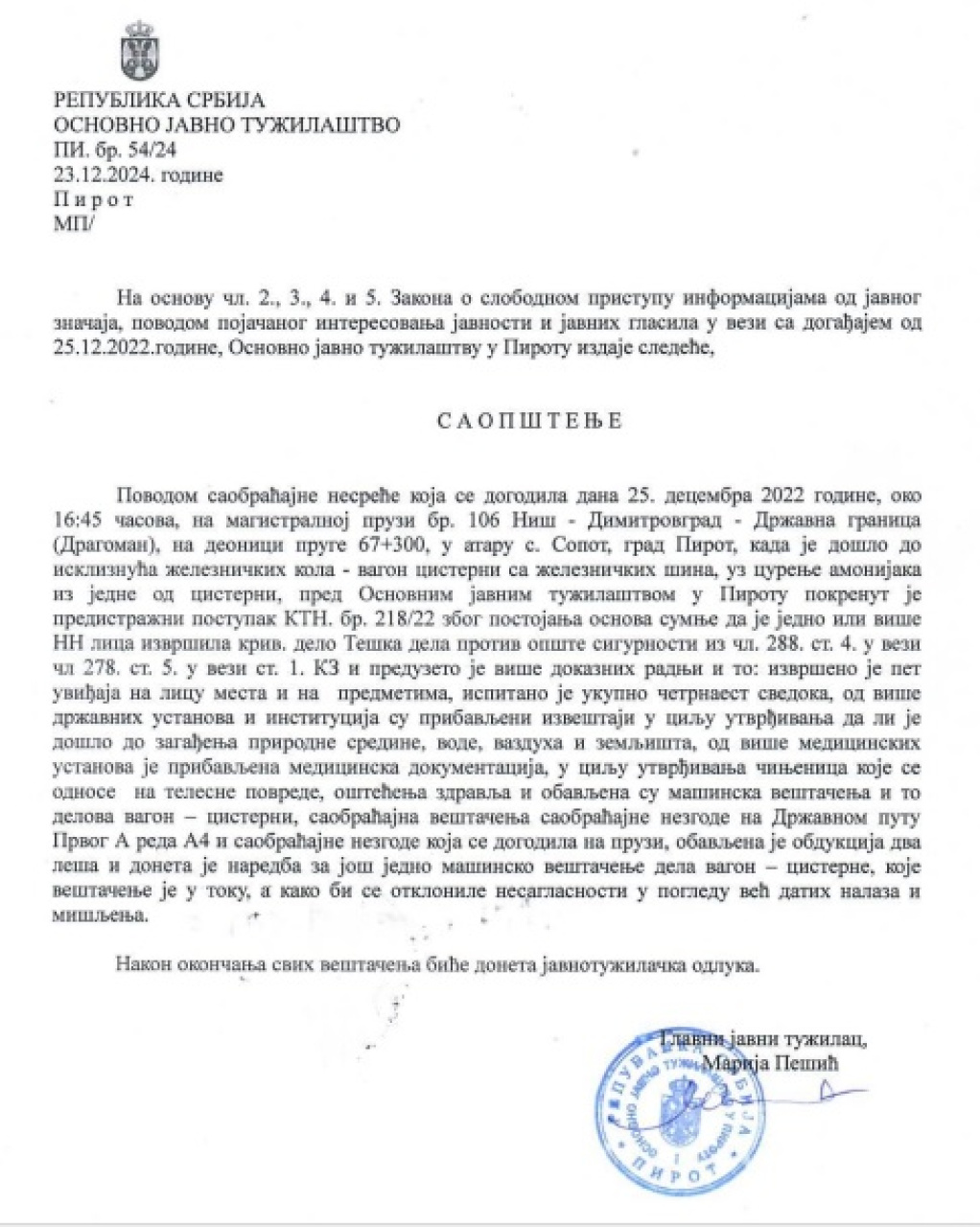 Druga je tema, ali neka danas bude izrečena, da u pravosudnim organima u Pirotu, a tako je izgleda i u mnogim drugim gradovima, postroji problem nedostatka tužilaca, u konkretnom slučaju i da je pored ostalih detalja, tokom istrage i ovo bio jedan od razloga za kašnjenje.