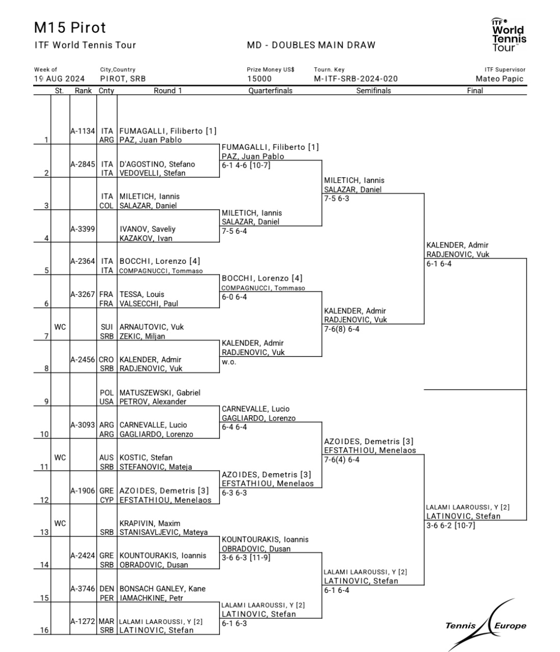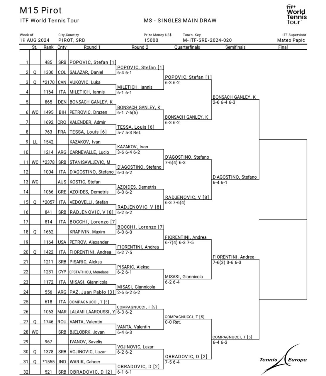Fjučers turnir u Pirotu ulazi u završnicu. Teniska akademija Todorović bila je i ovoga puta izuzetan domaćin. Uz podršku Grada i Sportskog centra vredni organizatori Bojan i Željko Todorović, uz pomoć službenih lica iz Teniskog saveza Srbije, obezbedili su sve tehničke uslove za takmičenje.