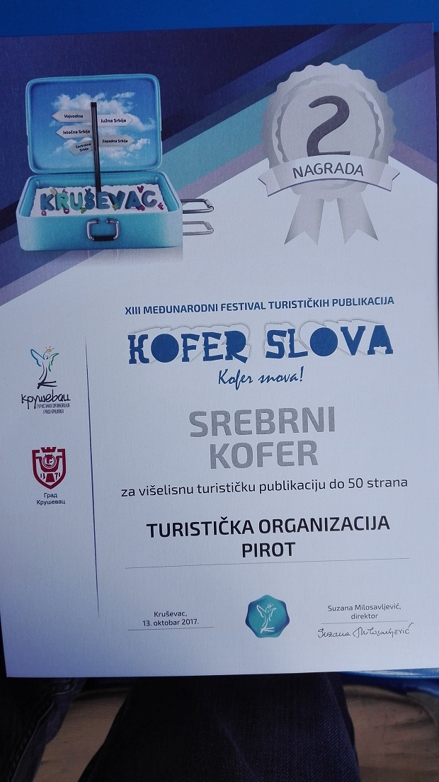 Turistička organizacija Pirot učestvovala na medjunarodnoj manifestaciji turističkih publikacija u Kruševcu pod nazivom KOFER SLOVA 2017. Tom prilikom, u konkurenciji od preko 30 turističkih organizacija iz cele Srbije, osvojila je Srebrni kofer, odnosno, drugu nagradu za višelisnu publikaciju Manifestacioni turizam!