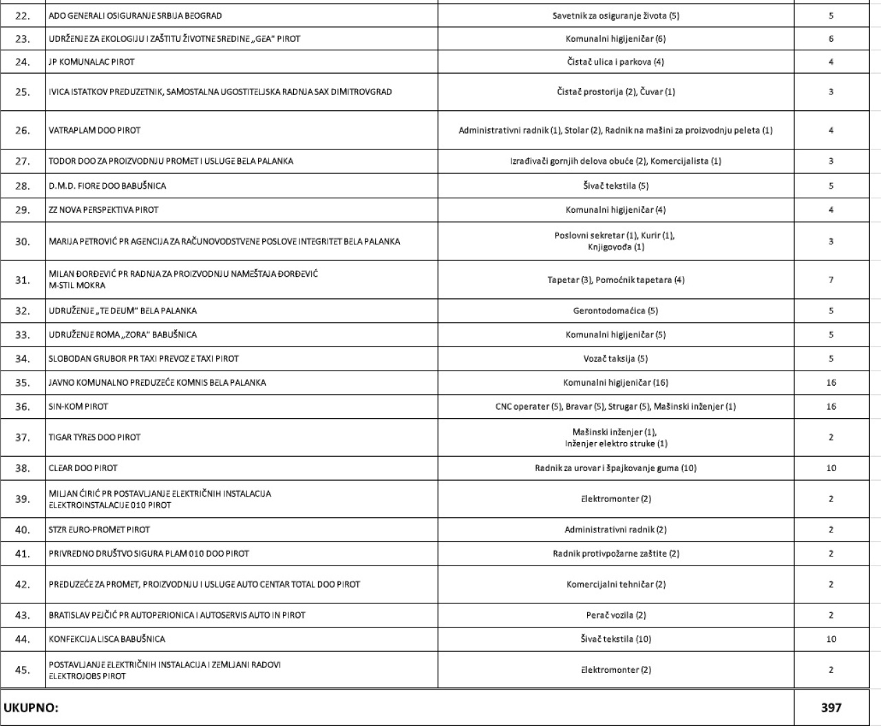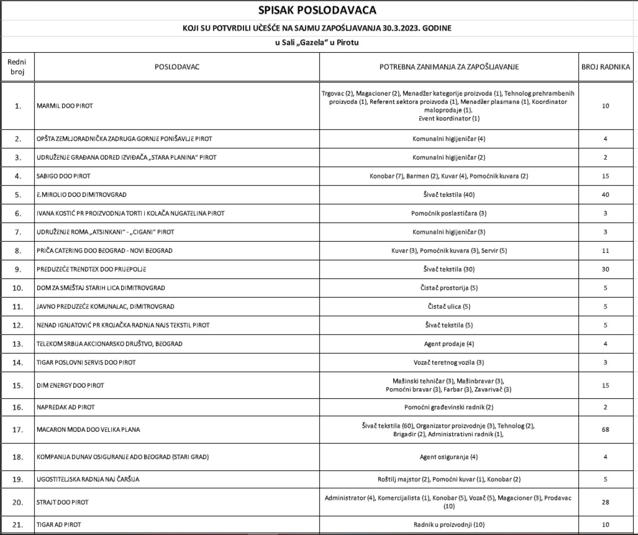 Najveći broj slobodnih radnih mesta poslodavci su iskazali za radnike u tekstilnoj industriji (krojač, šivač, tehnolog tekstilne konfekcije), mašinska industrija (bravari, zavarivači, mašinbravari, mašinski tehničari, mašinski inžinjeri), u oblasti saobraćaja (vozači kamiona), u oblasti ugostiteljstva (kuvari, konobari, pekari, poslastičari, prehrambeni tehničari), potrebe za radnicima tapetari, stolari, trgovci, magacioneri, menadžeri prodaje, agenti osiguranja, izrađivači gornjih delova obuće, gerentodomaćice i drugi, kaže Miljan Jonić, organizator programa zapošljavanja pirotske Filijale.