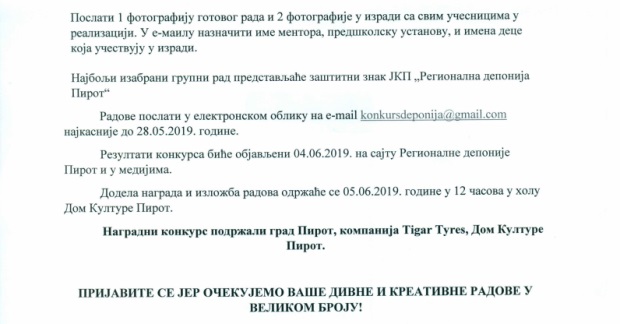 Povodom Svetskog dana zaštite životne sredine 5.jun, JKP "Regionalna deponija Pirot" objavljuje Nagradni literarni i kreativni konkurs na koji poziva sve učenike osnovnih škola i decu svih predškolskih ustanova na teritoriji Pirotskog okruga da se uključe.