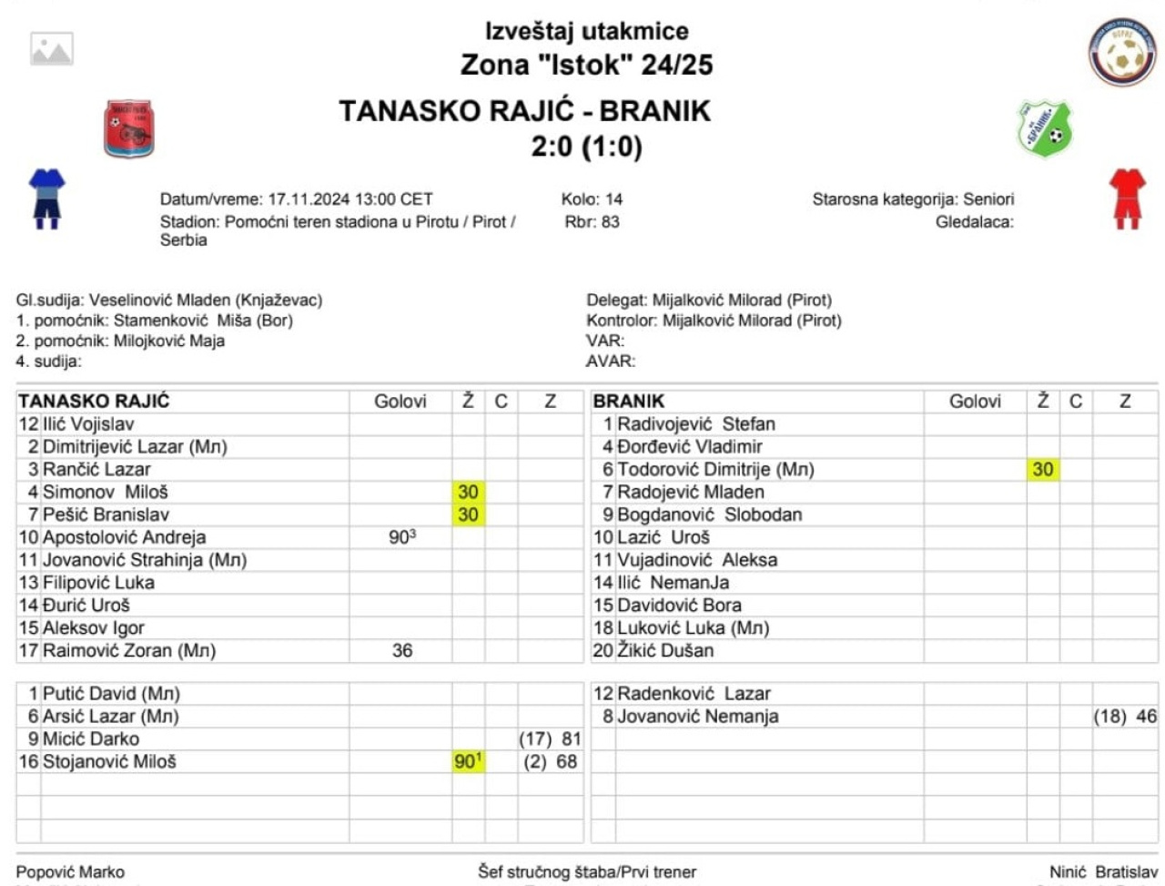 Pirot: Tanasko Rajić – Branik (Štubik) 2:0 (1:0)