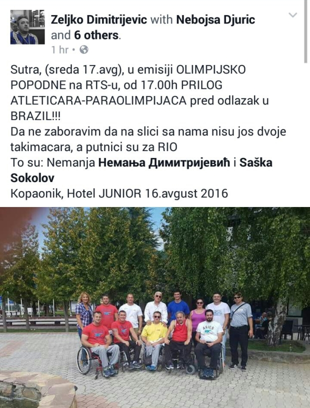 Na RTS-u danas , sreda 17.avgust od 17 časova biće emitovana emisija o paraolimpijskim reprezentativcima. O Saški Sokolov takodje.