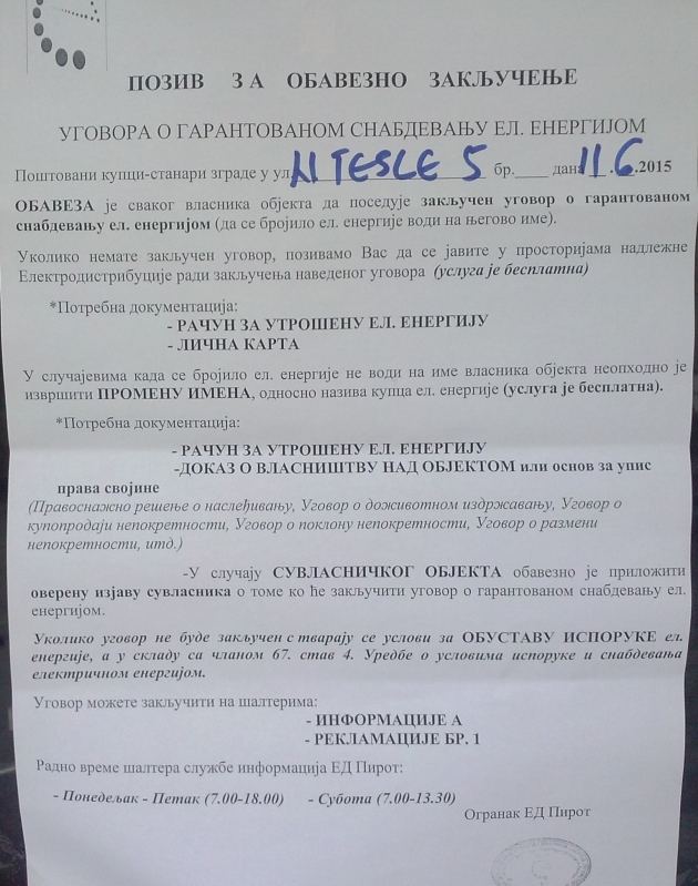 Od 01.januara 2015. godine svaki kupac električne energije je dužan da sačini ugovor o garantovanom snabdevanju električnom energijom sa nekim od snabdevača.Tim povodom počelo je,ovih dana, obaveštavanje potrošačima da postupe u skladu sa važećim zakonskim propisioma i potpišu ugovore kaže, Gordana Jakšić, direktor Poslovnog sistema u Elektrodistribuciji Pirot.