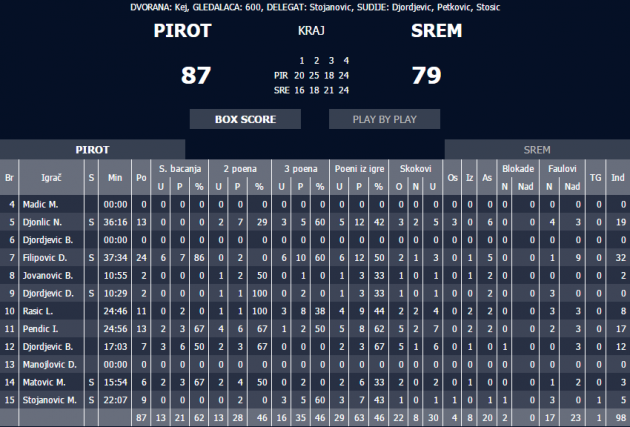 Pirot: Pirot - Srem 87 : 79 ( 20:16, 25:18, 18:21, 24:24 )