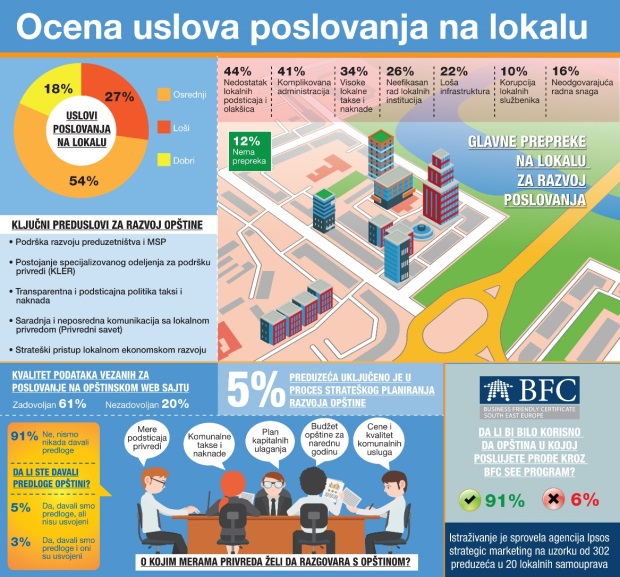 Privrednici u Srbiji ne prave veliku razliku kada ocenjuju uslove poslovanja na nacionalnom nivou i u opštini u kojoj posluju. U oba slučaja, više od polovine smatra da je poslovna klima osrednja, a između trećine i četvrtine da su uslovi za razvoj biznisa loši.