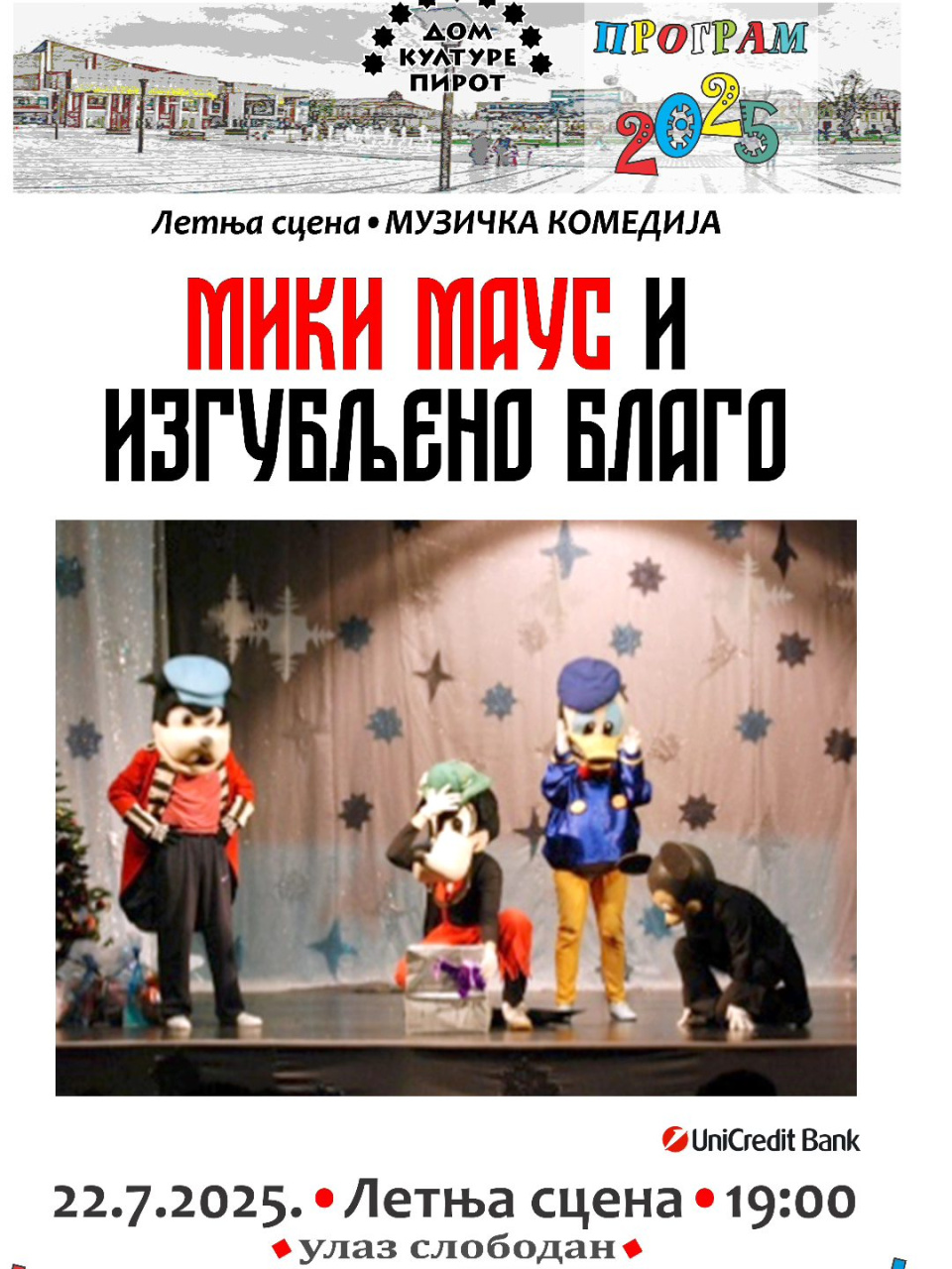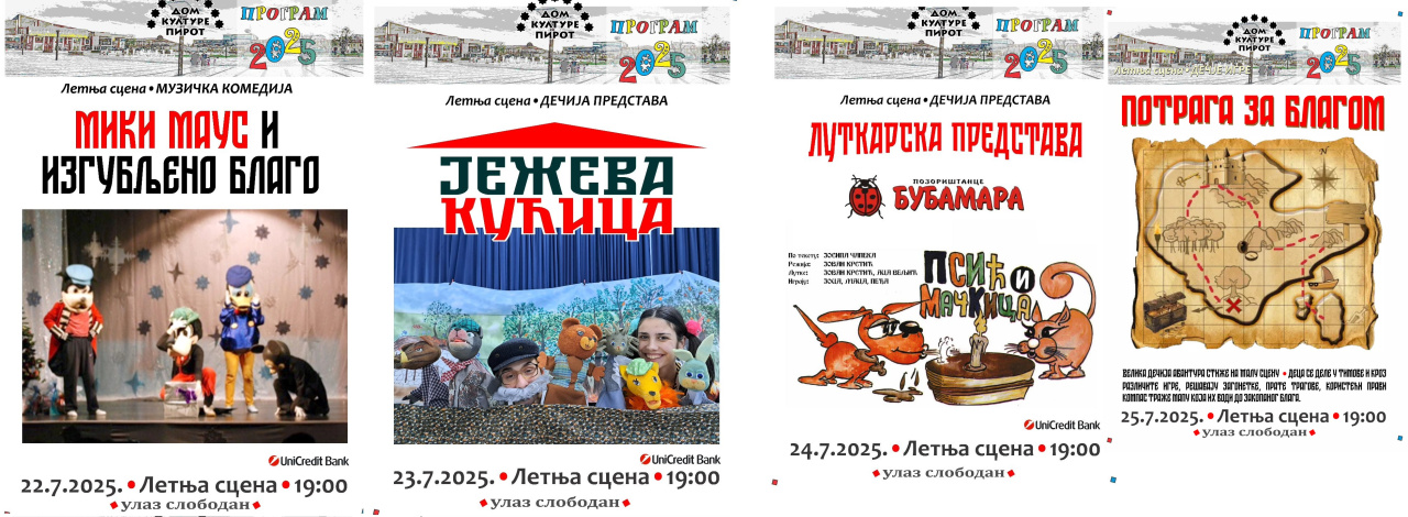 - Utorak, 22.07. 2025. od 19:00 sati na letnjoj sceni – dečija muzička komedija „Miki Maus i izgubljeno blago“. Ulaz slobodan.