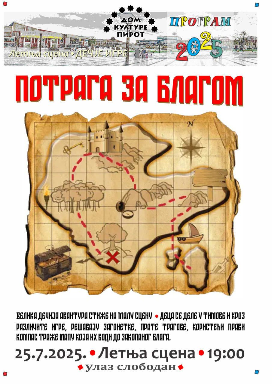 - Petak, 25.07. 2025. od 19:00 sati na letnjoj sceni – dečija igra „Potraga za blagom“. Ulaz slobodan.