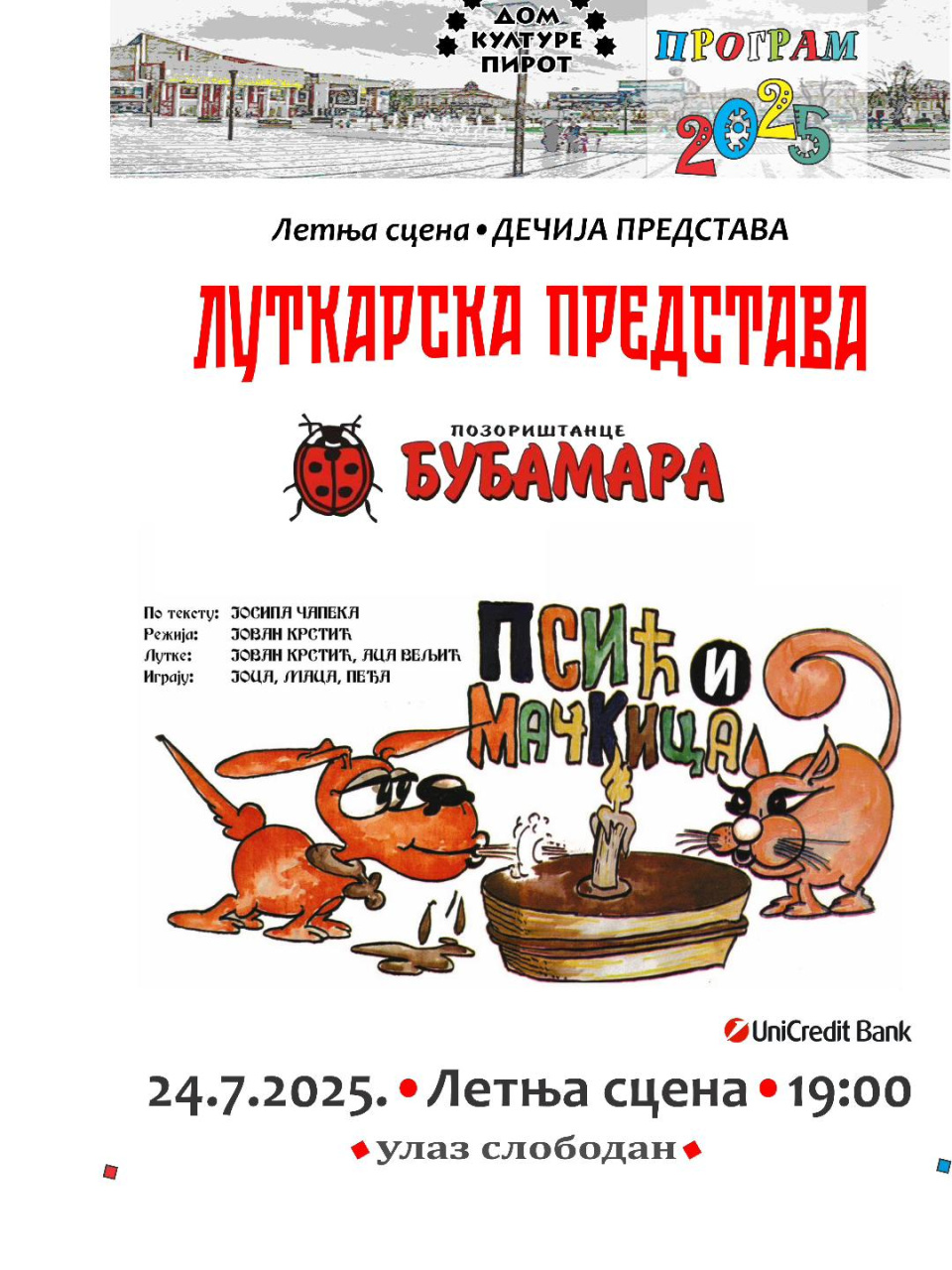 - Četvrtak, 24.07. 2025. od 19:00 sati na letnjoj sceni – dečija lutkarska predstava „Psić i mačkica“. Ulaz slobodan.