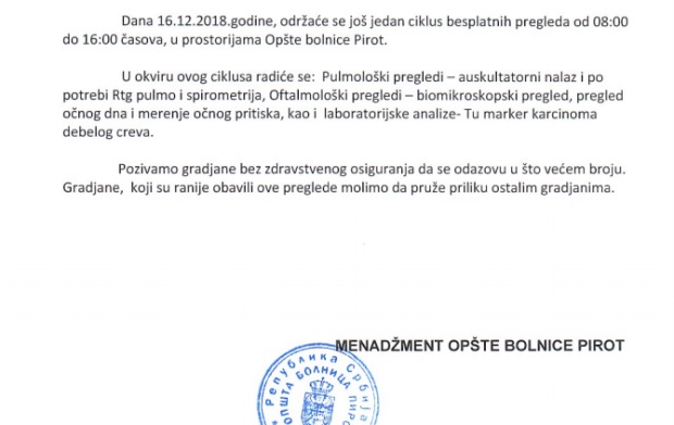 Nastavljaju se besplatni pregledi u Opštoj bolnici Pirot!