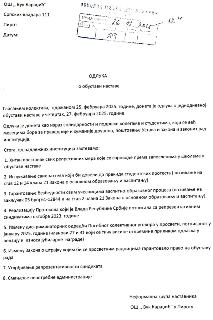 Nastavno osoblje OŠ "Vuk Karadžić" obustavlja rad u četvrtak. Solidarni sa kolegama, podrška studentima!