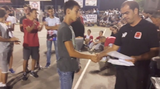 Andrija Raković, kapiten pobedničke ekipe prima nagradu u vrednosti od 10 hiljada dinara.