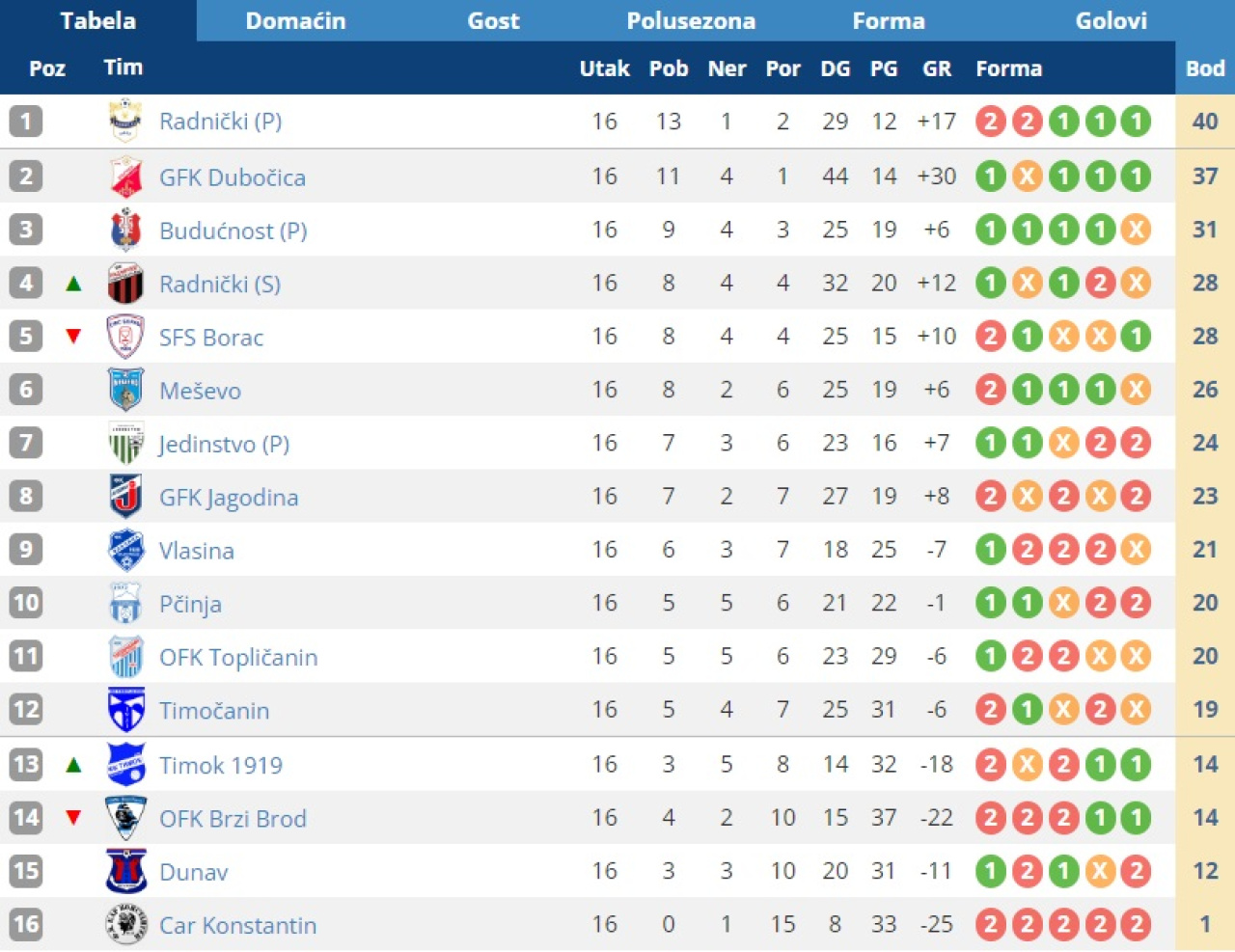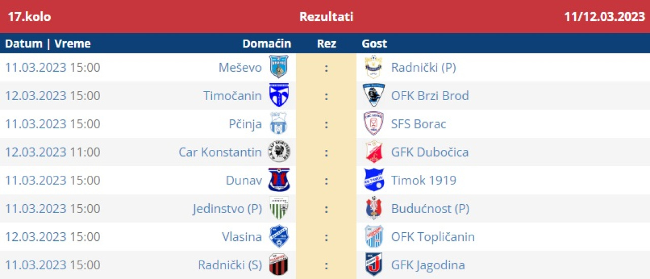 23. nov 2025. 18:32 Srpska liga Istok, 15. koloStadion "Dragan Nikolić"Pirot: Radnički - Timok (Zaječar) 1:2 (1:2)Radnički: Ristić, Antić, Tanasijević, Petrov, Mladenović, Ristov, S. Stanković, Dušanić (...