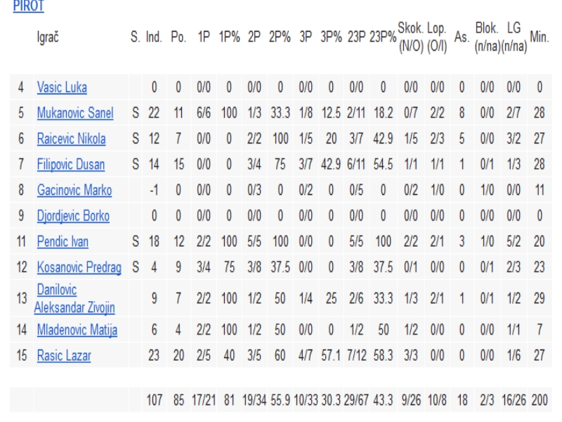 Pendić 12 (2:2) Djordjević , Kosanović 9 (4:3) , Danilović 7 ( 2 :2 ) 1 tr. , Mladenović 4 (2:2) , Rašić 20 (5 :2 ), 4 tr.