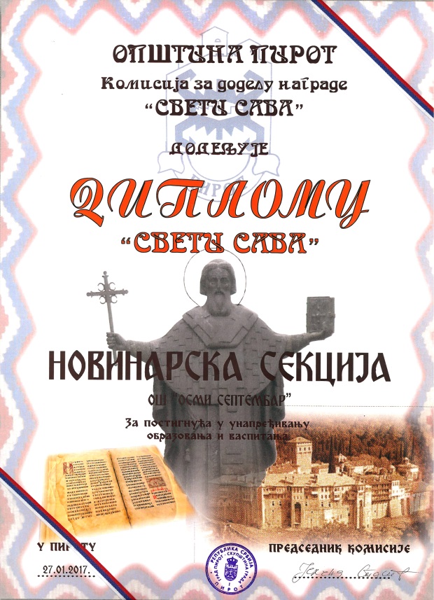 Ova težnja rukovodstva i nastavnog kadra da u skladu sa vremenom u kome živimo na prijemčiv i lako dostupan način predstavi svoj rad i dostignuća i otvori se prema javnosti naišla je na pozitivan prijem u gradu, pa je nedavno odlukom Komisije za dodelu priznanja „Sveti Sava” Novinarska sekcija škole za svoj trud i inovativnost nagrađena diplomom.