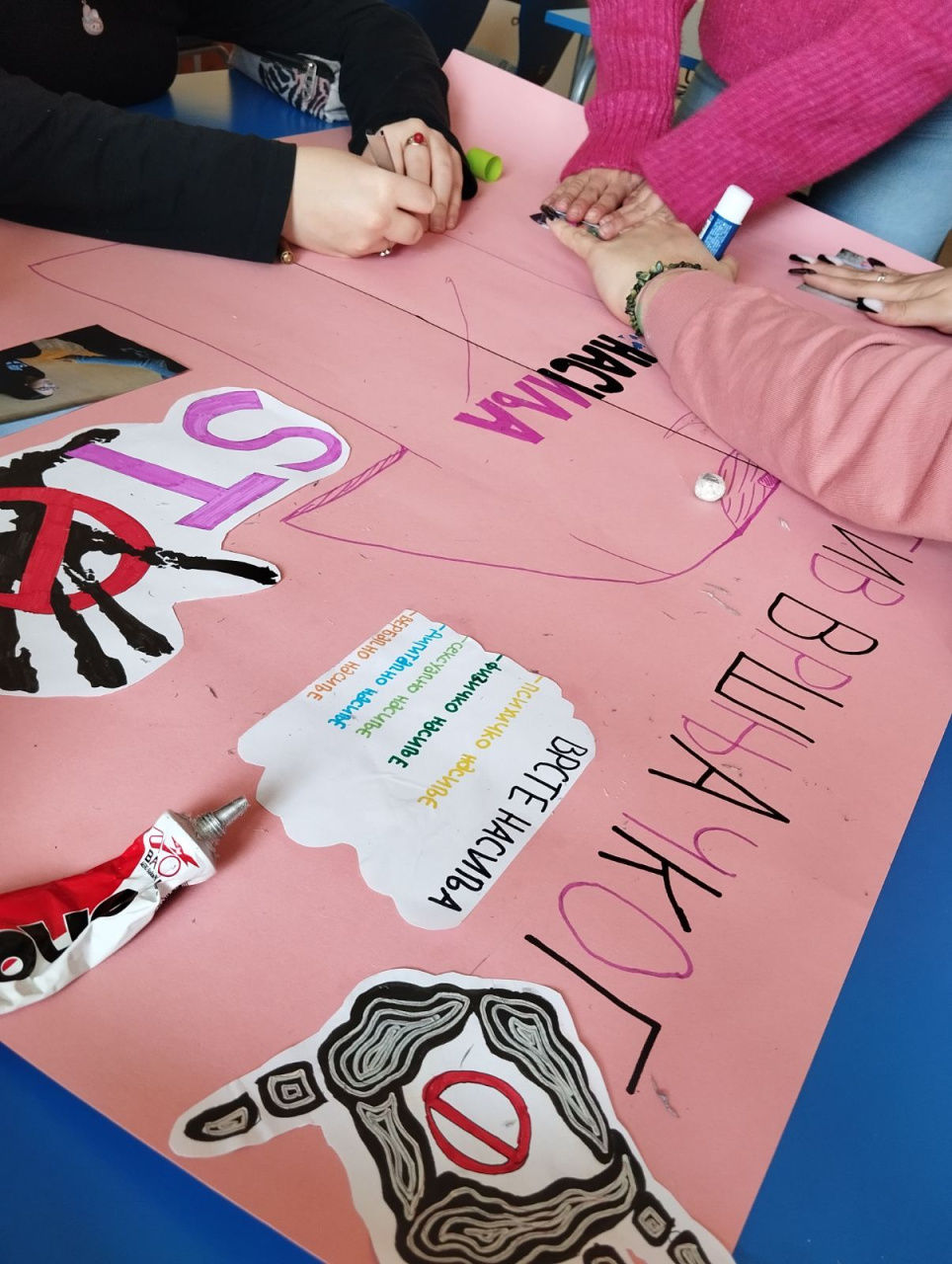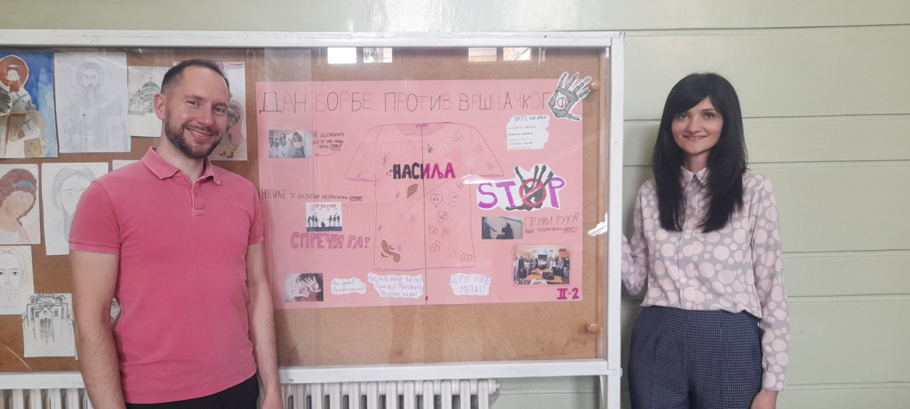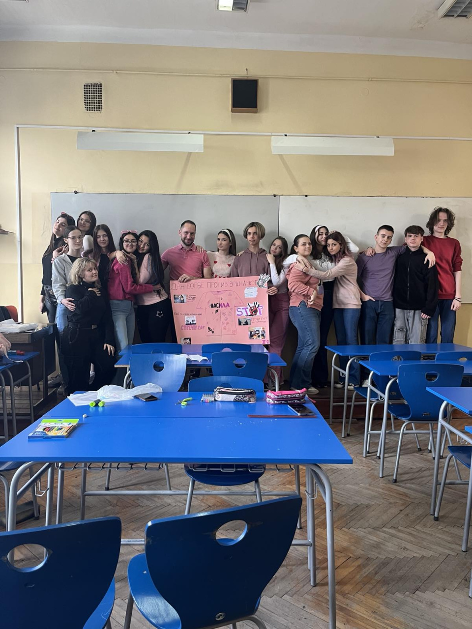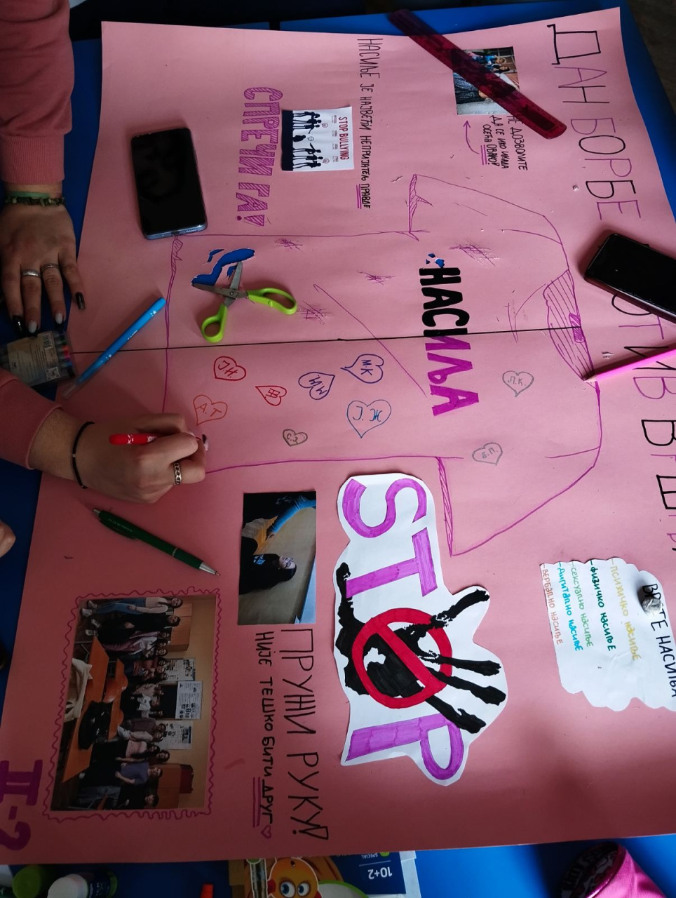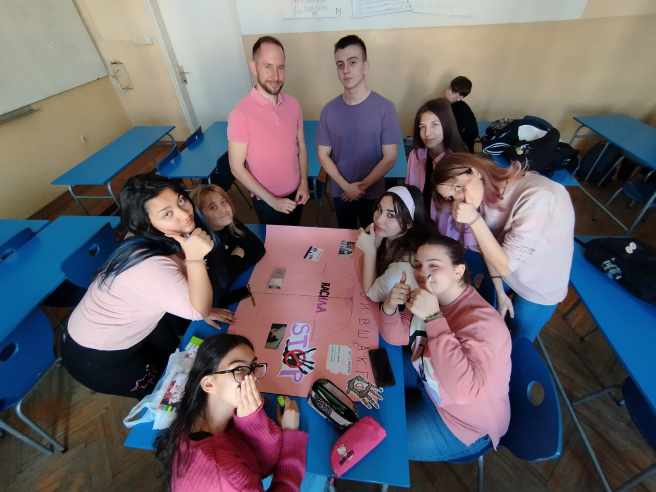 Akciju su podržali učenici i profesori naše škole simbolično noseći jedan odevni predmet u roze boji. U korelaciji srpskog jezika i književnosti i scenskih umetnosti, učenici drugog razreda scenskog odeljenja imali su kreativnu radionicu na temu vršnjačkog nasilja, uz podršku prefesora Branke Tanović Savić i Miloša Sokolovića.